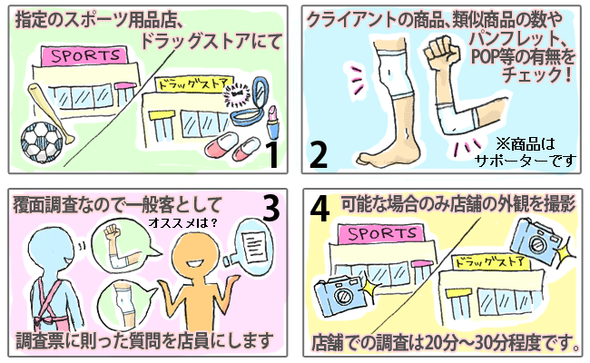 覆面調査なので一般客として店舗に出向き、店員にオススメ商品やメーカーをヒアリングします。また類似商品の数やパンフレット、POPの有無も確認します。