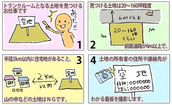 ・大きさが20〜160坪程度あること ・前面道路が6m以上あること ・半径2km以内に住宅地があること(山の中などはNG) ・土地の所有者や住所などの連絡先がわかる看板があること
