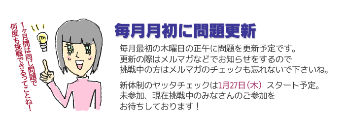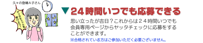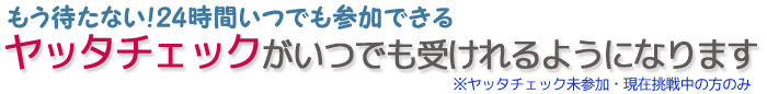現在までに第3回開催をしたヤッタチェック。今まで応募期間が限られていたため、「今すぐ受けたいのにー!」という声を多くいただき、今月からいつでも応募・参加ができるようになりました。